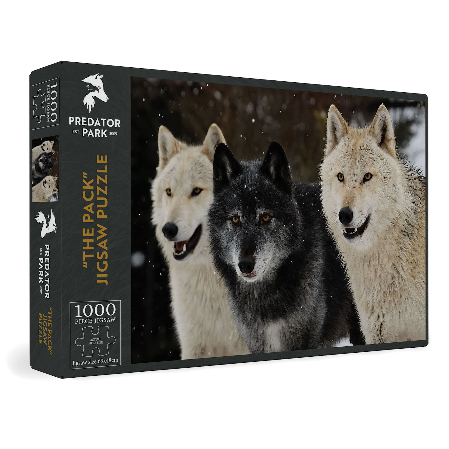 Celebrate energy, warmth and confidence with this stunning 1000 piece jigsaw of the Predator Park wolf pack Chenoa, Chitali and Cheveyo. Captured in a moment of quiet connection and shared purpose in a snowy ancient forest scene.