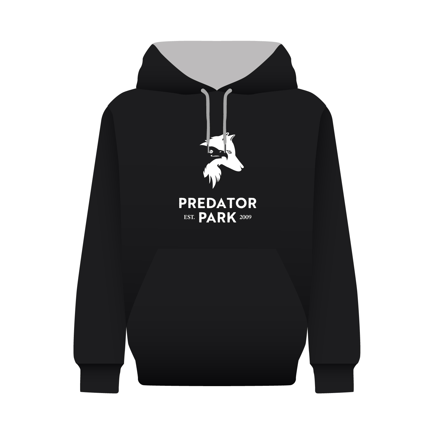 A Predator Park black unisex hoodie with grey cords and a grey hood lining. Comes with a plain back or a choice of two graphics.